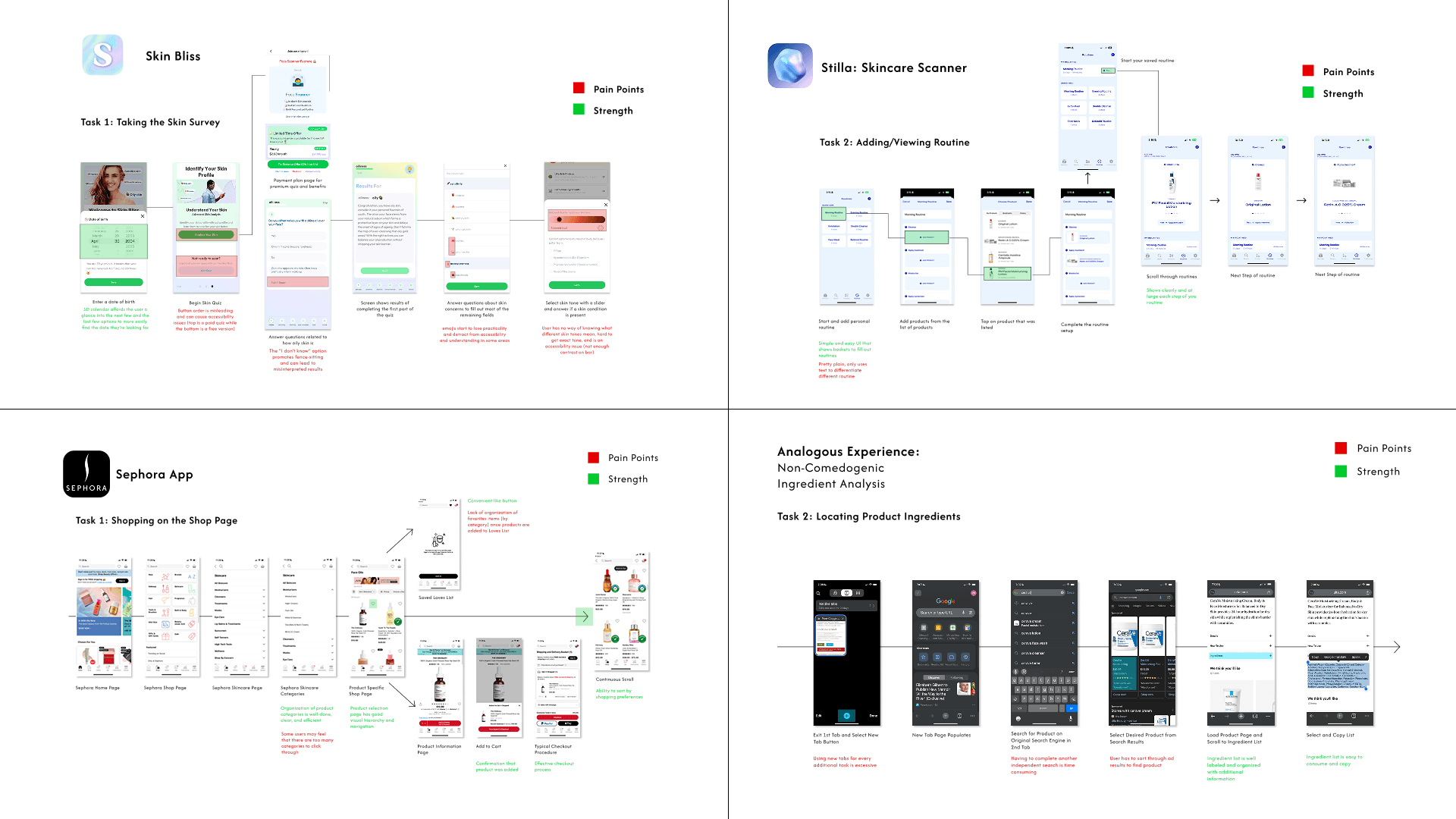 We started with secondary research on skin product management apps such as the Sephora app and Stilla. We took the apps and broke them down page by page to see what their pain points and strengths were to analyze what features are best for the goal.